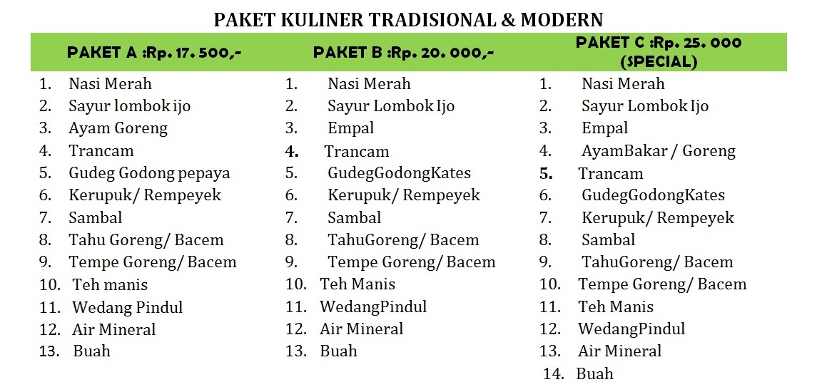 PAKET A : Rp. 17. 500,- Menu : Nasi Merah, Sayur Lombok Ijo, Ayam Goreng/ Ikan Bakar, Tranca, Gudeg Godong Kates, Kerupuk/ Rempeyek, Samba, Tahu Goreng/ Bacem, Tempe Goreng/ Bacem, Teh manis, Wedang Pindul, Air Mineral, Buah.